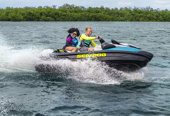 Equipado com compartimento estanque para celular, ampla plataforma de popa com sistema LinQ de engate rápido de acessórios, assento Ergolock bi-partido, compartimento frontal de acesso direto de 144 L, escada de reembarque e sistema de áudio Premium BRP opcional.
