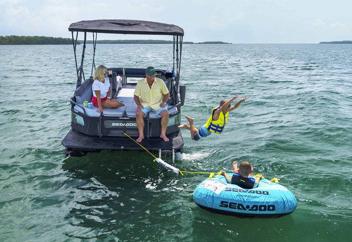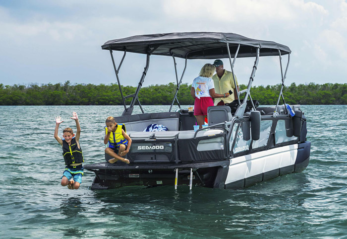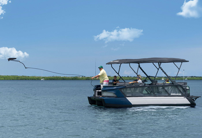 O modelo Cruise apresenta detalhes especiais de conforto, como capacidade para até 10 pessoas, sistema de áudio BRP, ampla plataforma de mergulho com sistema LinQ de engate rápido, GPS touchscreen Garmin de 7 pol. e muito, muito mais.